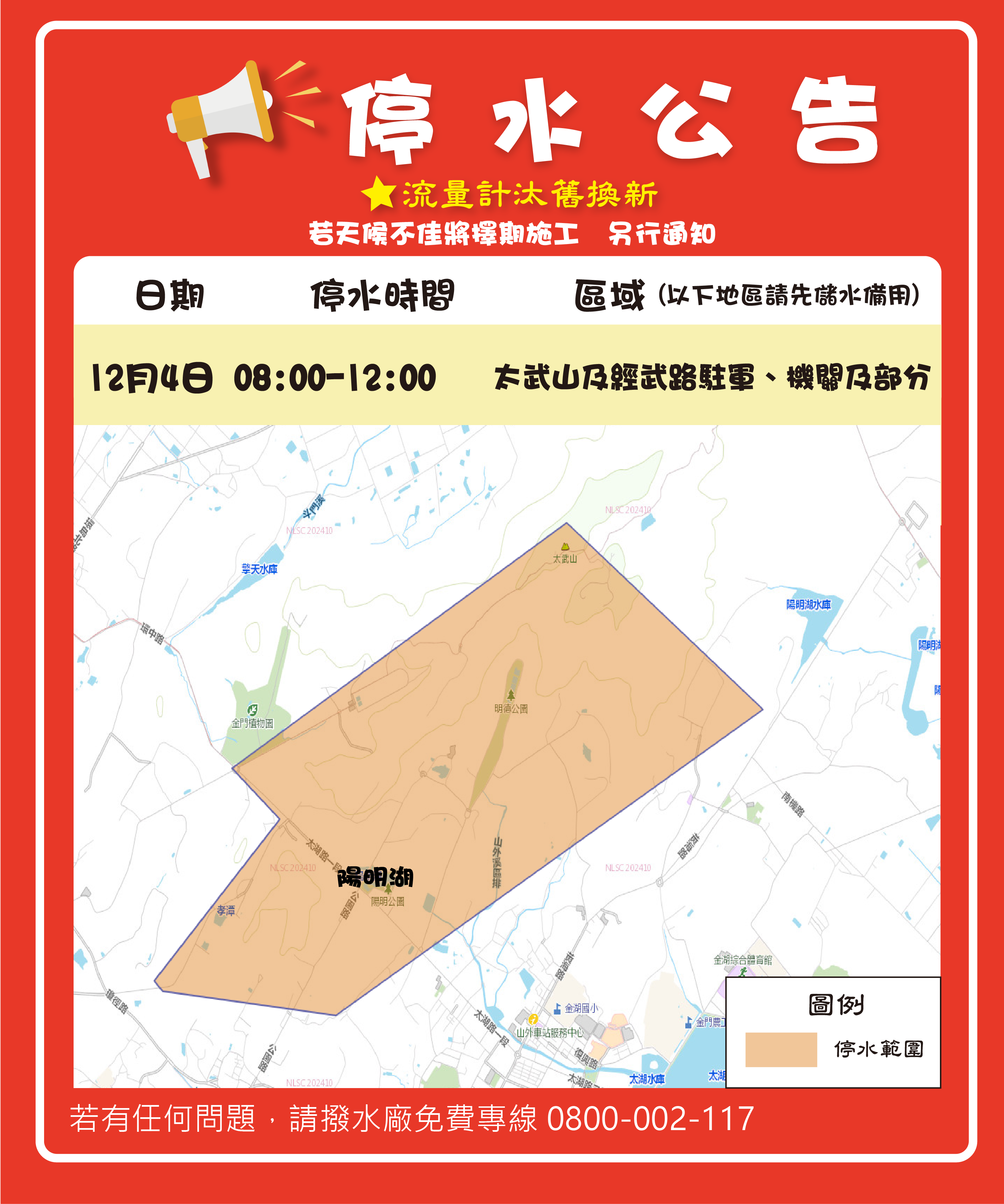 水廠為辦理流量計汰舊換新, 預定12月4日(星期三)上午8時至12時辦理停水施工作業,屆時請民眾預先儲水備用,另部分地區(末端或高處)因管線需進行排泥排空氣作業,可能延遲復水,敬請見諒。期間將會影響用戶用水,復水後自來水水壓、水質有不穩定之現象,請民眾多加包涵,若有任何問題,請撥免付費專線:0800-002-117,水廠將派員前往處理。 太武山及經武路駐軍、機關及部分用戶(詳下圖)。