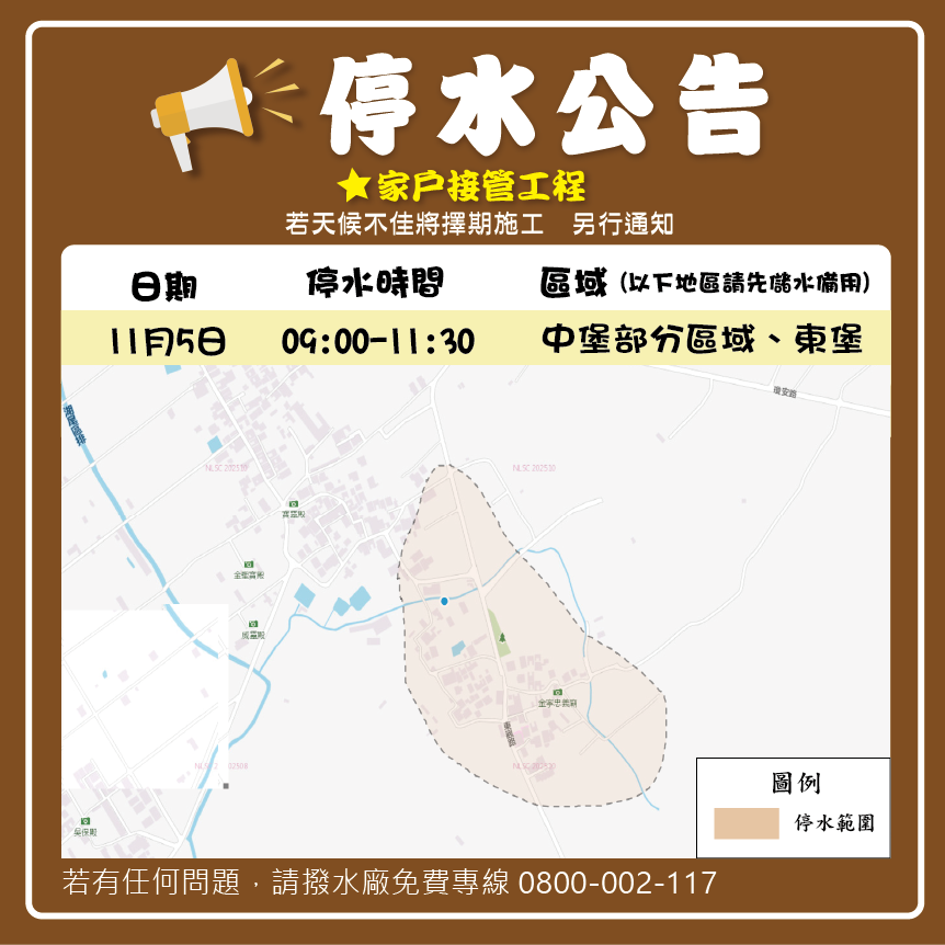 #停水公告 停水時間:114年11月5日(星期二)上午9時00分至上午11時30分停水影響供水之區域如後: 中堡部分區域、東堡 水廠為辦理家戶接管工程,進行金寧鄉湖尾村測段377之1地號改管工程,訂於114年11月5日施工,屆時請民眾預先儲水備用,期間將會影響用戶用水,復水後自來水水壓、水質有不穩定之現象,請民眾多加包涵,若有任何問題,請撥免付費專線: 0800-002-117,水廠將派員前往處理。